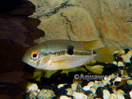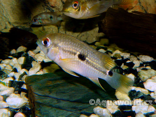 Jedná se o druh, který v České Republice není téměř k sehnání, občas se vyskytne u různých dovozců ryb (bohužel velmi často pod jiným názvem). Chování této Akary v akváriu je mnohdy velmi klidné bez projevů agresivity i když se najdou jedinci, kteří budou prohánět naprosto všechny ryby, ale téměř nikdy to nekončí zraněním. Tato klidovost končí ale s nástupem rozmnožování, pak se z nich stanou doslova rváči. Jako spoluobyvatele k nim lze přidat pouze stejně velké nebo statné ryby. Když jsou rybky mladé snadno se dají zaměnit s Akarou sedlovou. Jejich základní zbarvení je světle hnědé s olivovým nádechem. Od oka až po kořen ocasu se táhne tmavý pruh, jehož tmavost je závislá od nálady ryby. Skvrna uprostřed těla může být vystouplá až po okraj hřbetní ploutve. Tuto akaru můžeme naprosto bez problému chovat v zarostlé nádrži bez nutnosti chránit rostliny, pokud budou dostávat pestrou stravu tak si jich nebudou vůbec všímat. Častá výměna vody je i tady nutností, rybka sice není náchylná na chemismus vody, ale za to na bakteriální onemocnění. Proto doporučuji výměnu alespoň 10% týdně. Pokud jim chovatel chce dopřát může jim bez problému dávat očištěné žížaly, které si časem budou chodit brát z ruky.