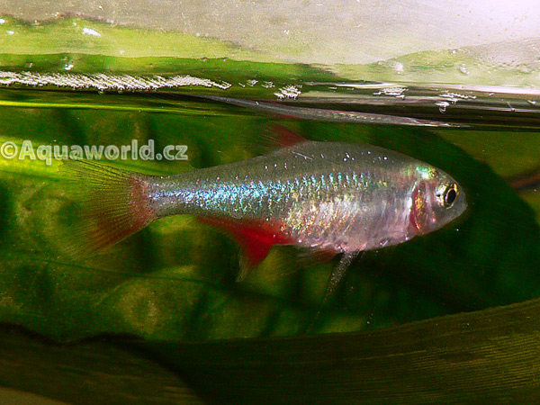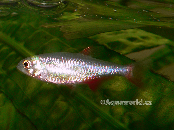 Jedná se krásnou hodnou, klidnou a hejnovou rybku. Díky malým požadavků se dá říct že je to ideální rybka pro začínajícího chovatele. Tento druh se chová v hejně o deseti a více kusech. Tělo je stříbrně zbarveno s nádechem modravého lesku, všechny ploutve, kromě prsních jsou červené. Rybky milují hustě zarostlé nádrže s možností dostatečného prostoru pro plavání. Nádrž musí být dobře zakrytá, aby rybky zbytečně neskákaly mimo akvárium. Jejich chov je zcela bezproblémový, jen pokud bude teplota nižší tak jejich barevnost tolik nevynikne. Jako společníky do nádrže k nim vybíráme podobné druhy teter. Pokud jim chovatel dopřává jejich podmínky, dožívají se i více jak 4 let.