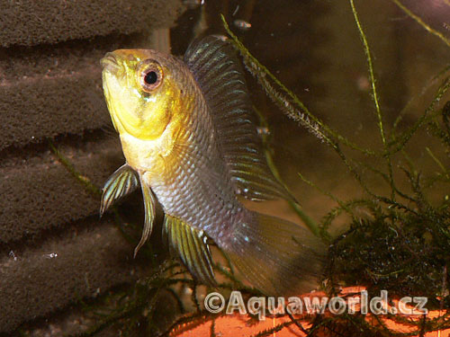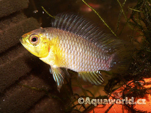 Rozpoznat pohlaví je docela jednoduché u dospívajících rybek. Samec je větší, tmavě žlutý na bocích s modravým leskem, který přechází do světle žluté barvy. Ploutve jsou namodralé a velmi protažené. Samice je menší do 5 cm, nevýrazně zbarvená konce ploutvý má spíše zakulacené. Ve správných podmínkách se rybky docela ochotně třou. Je třeba jim však zajistit vhodné místo ke tření. Samice klade jikry kolmo nebo ne strop jeskyně. Po nakladení jiker, se o ně stará samice a samec hlídá teritorium. Zhruba po 3 dnech se líhne potěr, který se za další čtyři dny rozplave. O rozplavaný potěr se už starají většinou oba rodiče. Potěr po rozplavání bez problémů přímá čerstvě vylíhlou artemii, zhruba po deseti dnech zvládá nasekané patentky. Růst potěru je velmi nerovnoměrný a je nutné třídění.