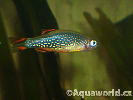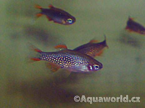 Jedná se o překrásnou, mírumilovnou a malou rybku vhodnou do menších dobře zarostlých nádrží. Do Evropy ji dovezli teprve nedávno v Září 2006. Ve své domovině je to rybka ohrožená, takže i akvaristé budou pomáhat jejímu osudu. Je to hejnová rybka, která se nemá chovat v počtu menším jak 10-15 kusů. Pokud je chcete vidět plavat po celém akváriu, je nutné aby v akváriu o objemu 50 litrů bylo nejméně 15 kusů, jinak budou zalezlé někde v trsu rostlin a vylézat jen když bude krmení. Pokud jsou v dostatečném počtu budou to velice aktivní a atraktivní rybky, ale vždy budou ve střehu. Samečkové mají v dospělosti při plném vybarvení podklad těla šedomodrý s fialovým nádechem, samice mají základ spíše hnědý s modrým nádechem. Na těle je drobná zlatavá kresba připomínající nedokonalé tečky. Včechny ploutve mají červené vybarvení.