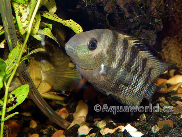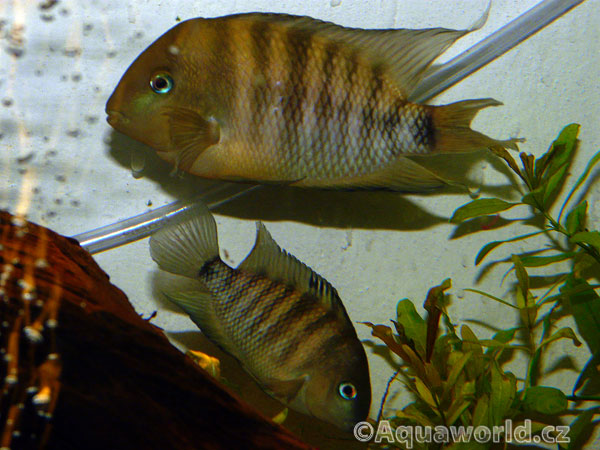 Jedná se o krásnou rybu, která se hodí do akvária společně jenom s podobně velkými rybami. Bez problémů se snesou i s čichavci (perleťový, modrý..). Tento druh je docela hodný mimo dobu tření. Výjimku tvoří samci, kteří málokdy snesou dalšího samce ve stejné nádrži. Chovat by se měli v zásadě pouze na páry. Pokud chceme mít klidný a harmonický pár, musíme jej nechat aby se vybral sám ze skupiny ryb. Pak jejich chování není ani při tření tak agresivní vůči ostatním obyvatelům akvária. Do doby než se rybky dostanou ke tření ani neryjí a neničí rostliny. Jejich základní zbarvení je zlatohnědé s fialovým nádechem. Přes tělo se line 6 až 9 příčných tmavých pruhů, které mohou při určité náladě ryb zcela zmizet. Bohužel jejich zastoupení v České republice je jen zřídka a dají se sehnat spíše ve specializovaných akvaristikách. Jako potravu mohou dostávat úplně vše až na hovězí srdce které jim působí velké trávící potíže.