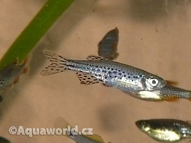 Samečkově jsou většinou drobnější a výrazně hubenější, také jejich ploutve mají červený nádech. Pokud chceme ryby rozmnožit musíme dát samečky zvlášť od samiček a to alespoň na 10 dní. Jakmile jsou samice připravené ( mají zakulacená bříška plná jiker), dáme k samcům které jsme před tím umístily do vytíračky zhruba o objemu 15 - 20 litrů. Na dně nádrže musí být rošt, kterým budou jikry propadávat, jinak si na nich rodiče s chutí pochutnají. Pro účely vytření rybek dáme do této nádrže jemnolisté rostliny (jávský mech), v nich se budou rybky třít. V nádrži musí být dostatečné proudění jinak se ryby nebudou rádi třít. Toho dosáhneme bud velmi silným vzduchováním, nebo použitím nějakého vnitřního filtru. Ryby jsou v prostředí čerstvé proudící vody stimulovány k hromadnému tření. Po vytření musíme rodičovské ryby ihned odlovit. Pro jikry je vhodné, aby voda měla celkovou tvrdost mezi 1 až 7°dGH a hodnotu pH 6,5-6,8. Teplotu můžeme o něco málo zvýšit až do horní hranice 27°C. Při tření se sameček snaží dostat pod bok samičky a snaží se zaklesnout ohnutě přes její hřbet. To je okamžik, kdy jsou jikry uvolňovány a samec je ihned oplodňuje. Rybky necháváme vytírat v poměru 3 až 5 samců na 1 až 3 samice. Až do vlastního rozplavání visí plůdek na rostlinách a na stěnách akvária. Poté, co se veškerý potěr rozplaval bude nutné krmit hned tím nejjemnějším prachovým krmivem, nebo vařeným žloutkem popřípadě sušenými vejci v prášku, doporučuji i sera micron, pak přežije asi 50 až 70% potěru. I přes velkou péči je tento druh velice choulostivý.