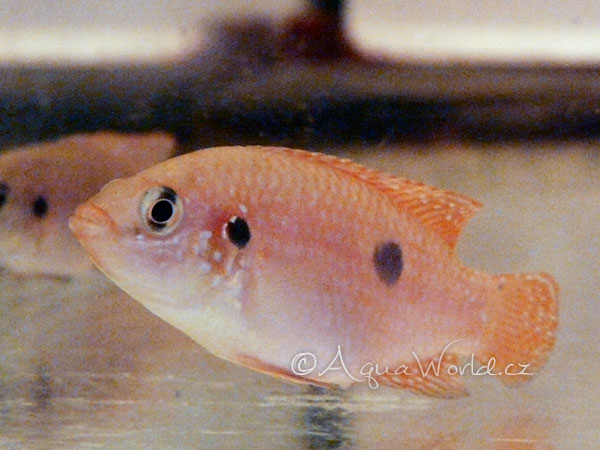 Jedná se o perlovku, která má trochu zavádějící český název červená, vůbec nerozumím tomu proč se ji česky neříká dvouskvrná neb má tyto dvě skvrny jako hlavní poznávací znak oproti jiným perlovkám. Její zbarvení je co málo výrazně červené spíše se dá hovořit o téměř zelenočerveném podkladu (mimo dobu tření). Jako další je fakt že tyto perlovky nejsou posety tečkami v perleťové barvě, ale sem tam nějaká na chovatelovo oko přeci jen vykoukne. Svou povahou se dají přirovnat k běžným africkým cichlidám, které se hlavně vyznačují neustálým pocitem hladu. Perlovky obecně potřebují velký přísun potravy, pak jejich agrese vůči spoluobyvatelů značně klesá. Pro perlovky volíme akvárium se spoustou úkrytů a kamenitým, nebo písčitým dnem. Rostliny do přítomnosti perlovek volíme spíše tuholisté s velkým kořenovým systémem (V. gigantea, nebo větší cryptocorýny). Sehnat tyto perlovky je spíše vzácností, velmi často se setkáte s informací že tyto ryby někdo nabízí, ale většinou se jedná o různé křížence (lifalili x guttatus, nebo lifalili x bimaculatus). Dnes jen málo obchodníků ví jak přesně ryby rozpoznat a pak prodávají různé nesmysli, dokonce jsem v jedné pražské akvaristice zažil příběh, kdy prodavačka vysvětlovala že ty modré perlovky jsou kříženci akary modré a perlovky obyčejné.