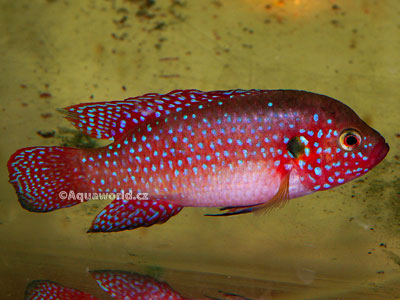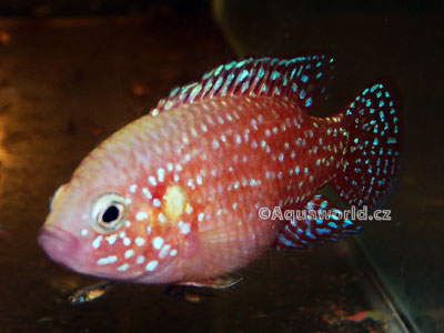 Rozmnožování těchto perlovek není nikterak složité jen musíme mít správně sestavený chovný pár. K sestavení chovného páru je nejlepší pořídit si skupinu tak 10-ti ryb různé velikosti ideální by bylo z různých zdrojů. Rybky se zhruba ve velikosti kolem 6-ti centimetrů začnou dvořit a značit si svá teritoria. Samice v těchto případech bývají mnohem menší a více agresivnější než samci, jakmile se nám pár utvoří odlovte ostatní spoluobyvatele do jiné nádrže, vyhnete se tak stresu chovného páru, který velmi těžko přijímá změnu prostředí. Pokud tuto možnost nemáme a musíme přelovit pár od ostatních musíme počítat že zhruba 2 až 5 týdnů budou plaché a do doby než budou mít mladé budou téměř nevybarvené. První výtěr perlovek je většinou komplikovaný a rodiče většinou své mladé nebo jikry ve velmi brzké době pozřou, a pokud jsou ve stresu je tato situace o to víc předvídatelná. Pokud nejsou rybky ve stresu, jsou před třením a v době kdy mají mladé co nejsytěji zbarveni. Perlovky se nejradši třou na povrch kamenů, květináčů, nebo jiného podkladu, jen zřídka se vytírají do květináčů nebo jeskyň. Podle stáří ryb se i počet jiker velmi liší máme-li ryby v perfektní kondici a 100% dospělosti můžeme očekávat až okolo 300 jiker. Plůdek se začíná líhnout v závislosti na teplotě vody zhruba za 24 hodin při teplotě cca 25 stupňů, většina samic pomáhá plůdku ven z jiker a vypadá to jako kdyby jsi pochutnávala na jikrách, plůdek okamžitě stěhují do co možná nejvíc nepřístupných míst. Za další zhruba dva dny se mladé perlovky rozplavou a drží se v těsné blízkosti rodičů, jako první potravu je jim dobré nabídnou vířníka, nebo velmi jemnou čerstvě vylíhlou artemii, již třetí den jsou ochotny přijímat odskořápkovanou artemii a za další dva dny humří vajíčka, zhruba po dvou týdnech je možné rybky krmit nasekanými patentkami, nebo jemnou artemií dospělci. Mladé rybky rostou opravdu rekordně rychle, jen je potřeba mít na paměti že jim musíme udržovat velmi čistou a čerstvou vodu, jinak nám mohou bez příčin hynout. Mladé můžeme nechat s rodiči až do příštího tření, velmi dobře poznáte že obě ryby odhání mladé pryč od sebe a straní se jich, ale neublíží jim. Při dobrém krmení a výměně vody mají mladé v té době okolo jednoho centimetru. Při opravdu dobré péči se mladé ryby mohou dostat na velikost okolo 4 až 5 centimetrů už za tři, až tři a půl měsíce.