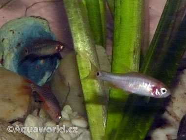 Pohlavní rozdíly jsou viditelné teprve když máte dostatečně velké jedince (aspoň centimetr), kteří nežijí ve stresu. Pohlavně dospívají ve velikosti od 15 mm. Sameček je drobnější než samička, u které nejsou moc vidět příčné modré pruhy. Voda pro rozmnožování by měla mít tvrdost okolo 10 °dKH a Ph okolo neutrálu. Rybky se třou v blízkosti rostlin kde také najdeme jikry. Pokud nám jde o úspěšný odchov s vysokým počtem potomků, musíme jikry dát do zvláštní nádrže. V opačném případě pokud je nádrž dostatečně zarostlá může přežít až polovina rybek. Pokud chceme odchovat co největší počet jikry přelovíme do nádrže okolo 10 litrů. V nádrži by měl být jávský mech nebo hnědovka křídlatá, akvárium umístíme na slunečné místo a zavedeme vzduchování. Zhruba za 3 dny se z jiker velkých asi 1 mm líhnou larvy ve velikosti okolo 3 mm. Po té další 3 dny leží na dně, teprve pak je vidět snaha o rozplavání. První krmení může být trepkou nebo jinými velmi malými nálevníky, čerstvě vylíhlou artemii nejsou schopni pozřít. Zhruba po týdnu od rozplaváni jsou teprve schopni chytit živou artemii, za další týden jsou již schopné běžného života a přijímají jakoukoli potravu. Za měsíc od vykulení mají i při nejlepší péči okolo 5 mm a jejich další růst je velmi pomalý.