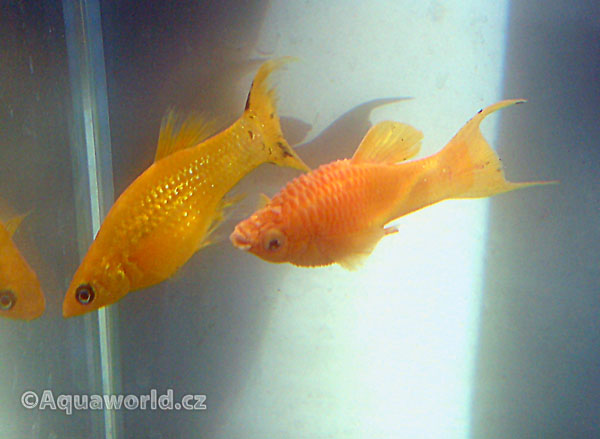 Samec je od samice lehce rozpoznatelný, jakmile dospěje. Do doby než jsou rybky pohlavně dospělé se pohlaví nedá určit pouhým okem. Samec má řitní ploutev přeměněnou v gonopodium, je menší a štíhlejší než samice. Po oplození je samice v březosti okolo 30 až 50 dní v závislosti na teplotě vody, velikosti samice a potravě. Těsně před porodem má břicho hranatého tvaru a to je hlavní impuls pro chovatele aby samici přelovit do samostatné nádrže kde bude velmi mnoho jemnolistých rostlin tak aby v nich mohly čerstvě narozené rybky najít úkryt. Samice rodí živá mláďata zcela schopná života, za pár minut po porodu již začínají shánět svou první potravu. Porod během kterého přivede samice na svět 10 až 120 mladých trvá okolo 10 minut až 5 hodin. Jako první potravu mohou mladé rybky dostávat cokoli co dokáží pozřít. Při pravidelném krmení a teplotě vody na 25 C rostou bleskovou rychlostí a za dva měsíce můžou mít kolem 3,5 až 4 cm.